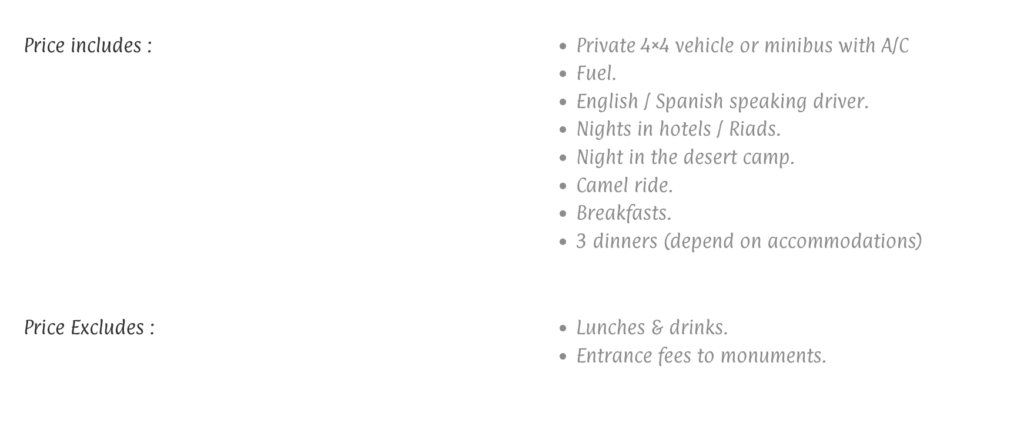Wake up early in the morning is a must do, in order to contemplate the beautiful sunrise, in the middle of the desert. Free time for breakfast. Then you return on camels to Merzouga, where the driver awaits. We dedicate the day to explore the region of Merzouga. The area has so many incredible sites, from sand dunes, wild lake, mines, fossils areas to fabulous oases. Which are ideal places for so many outdoor activities.