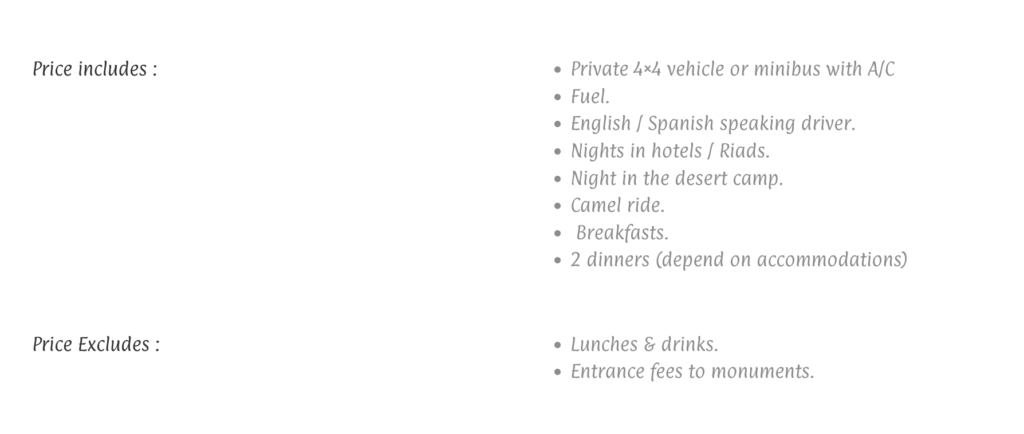 We depart to visit the famous Kasbah of Ait Ben Haddou. A fortified village recognized as a World Heritage Site by UNESCO. Furthermore, the Kasbah has appeared in many movies including : Gladiator, Alexander, The Mummy…etc. And TV series including Game Of Thrones. Then we continue to Marrakech, by driving through the Tizi-N-Tichka pass, and the High Atlas Mountains. Stops will be made for lunch, and to take pictures at interesting spots. Finally, we reach Marrakech, then we drive you to the airport or your accommodation. End of the 5 day Morocco tour.